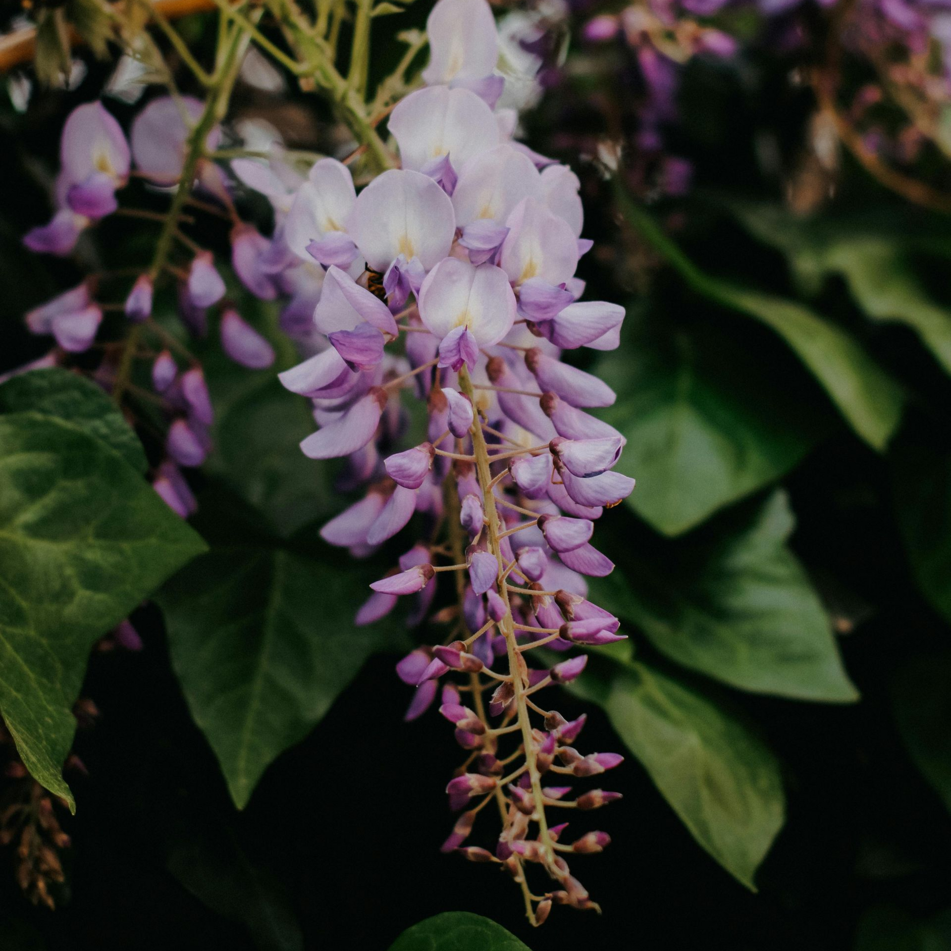 In spring, long clusters of purple or white flowers hang from the vines like natural chandeliers. The woody stems grow quickly and twist tightly around supports.